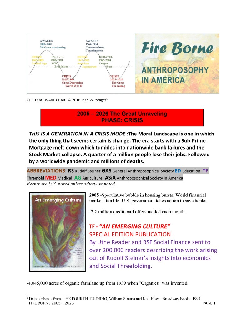 <<<This final chapter starts with a reference to the 2005 publication, “AN EMERGING CULTURE” in which UTNE READER and RSF SOCIAL FINANCE described how the “seeds” borne on spiritual winds after the 1923 Goetheanum fire had sprouted and helped change in American culture.
